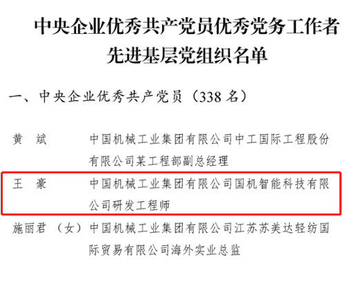 王豪榮獲國務院國資委黨委表彰的“中央企業(yè)優(yōu)秀共產(chǎn)黨員”稱號。