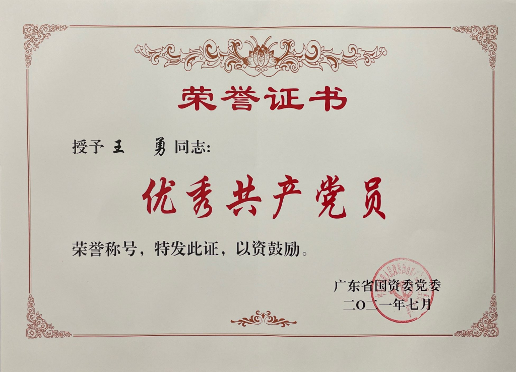 王勇榮獲廣東省國資委黨委表彰的“廣東省國資系統(tǒng)優(yōu)秀共產(chǎn)黨員”稱號。