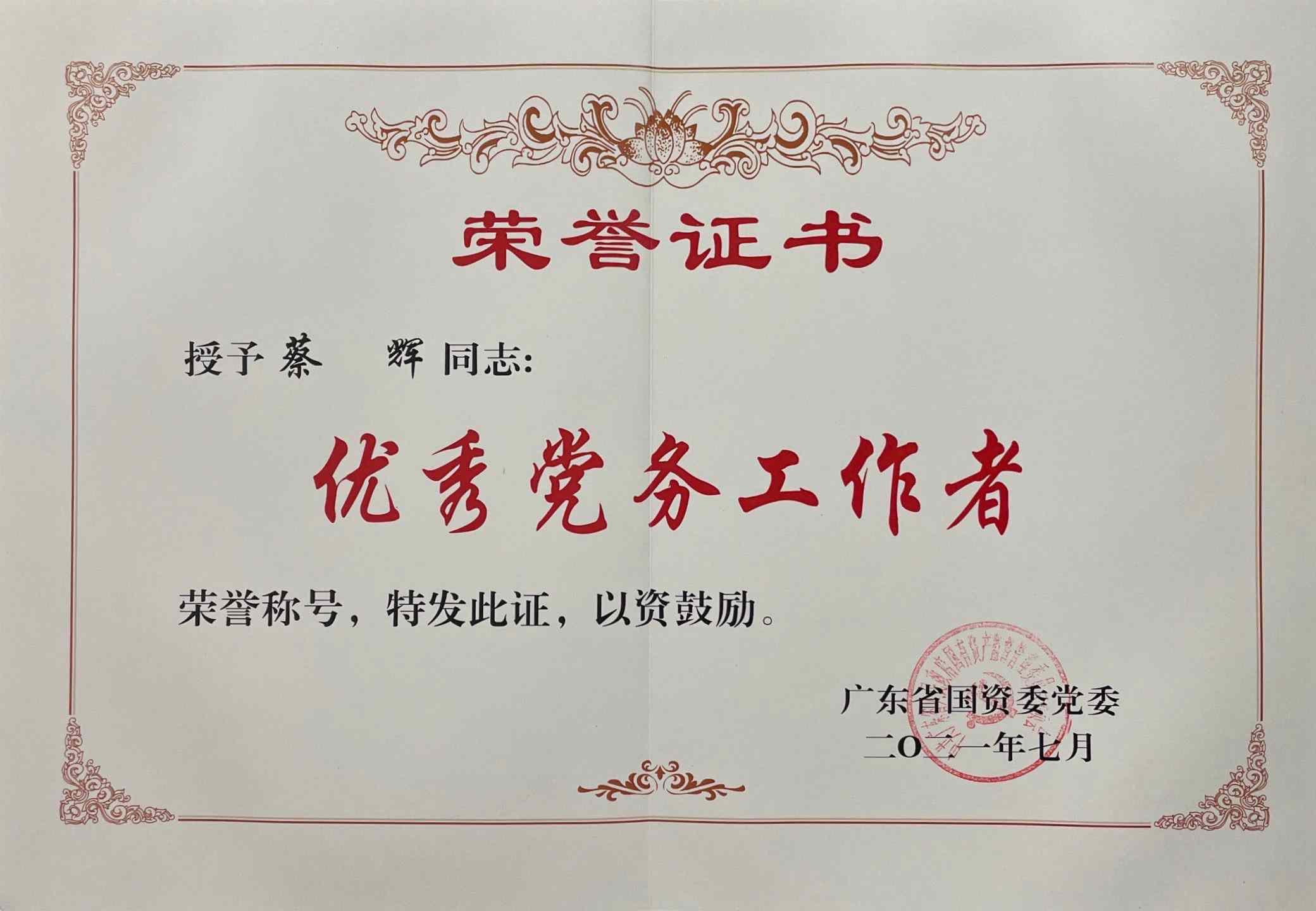 蔡輝榮獲廣東省國資委黨委表彰的“廣東省國資系統(tǒng)優(yōu)秀黨務工作者”稱號。